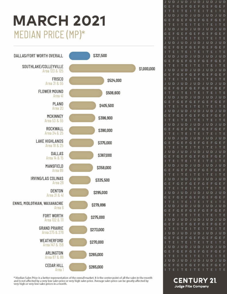 DFW’s market stats reflect a need for listings and a potential to profit off the sale of your house. According to North Texas Real Estate Information Services (NTREIS), listings in Dallas/Fort Worth had a median “Days on Market” of 45 in March 2021, 18 days less than the year prior. In addition, the median home price in DFW came in as $282,865 in March 2021, an increase of over 14 percent from the year before. Check out the infographic below to learn more about median home prices in various markets we serve.